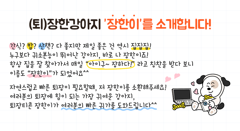(퇴)장한강아지 #퇴장티콘 의 주인공 '장한이'가 여러분의 센스있는 퇴장 분위기를 도와드릴게요!